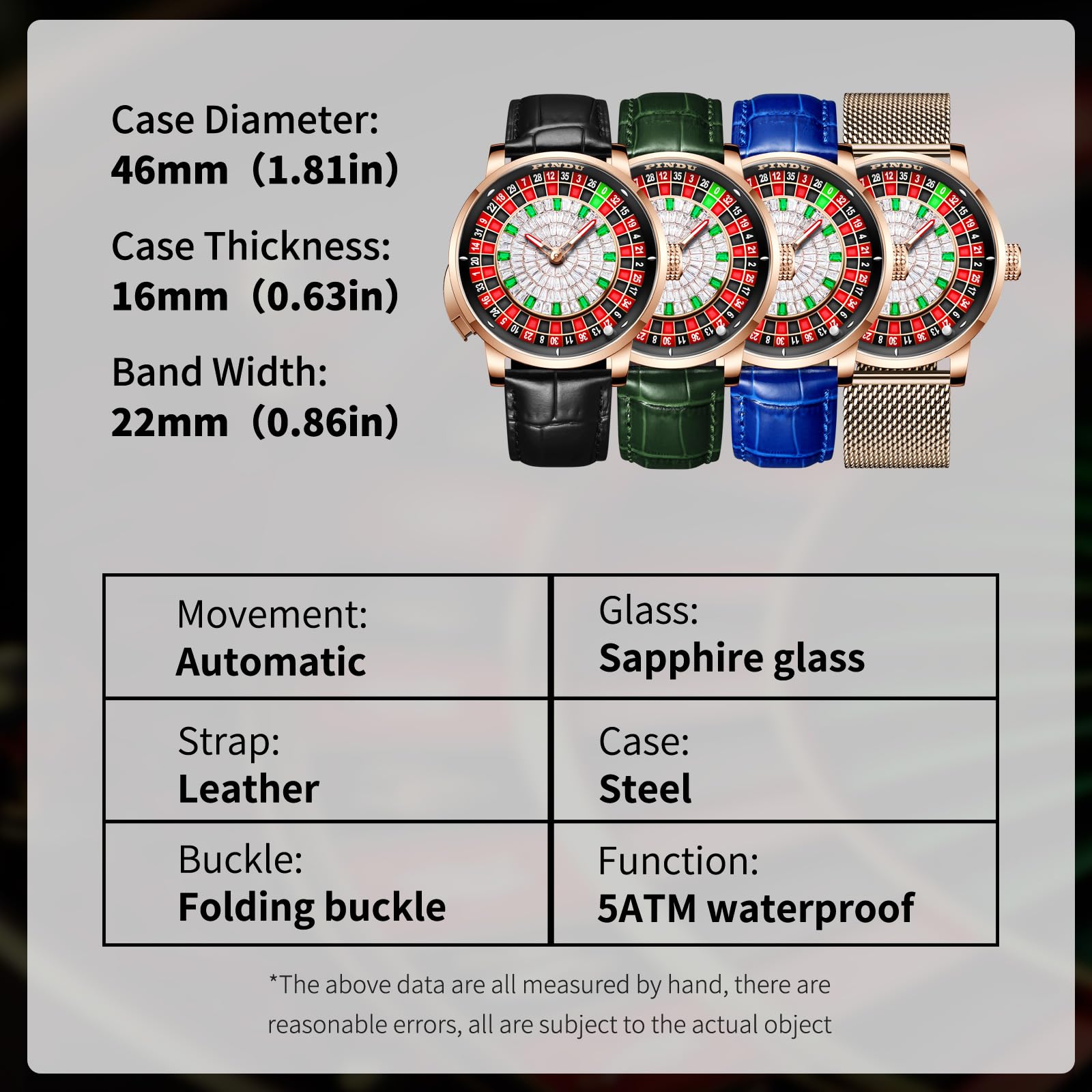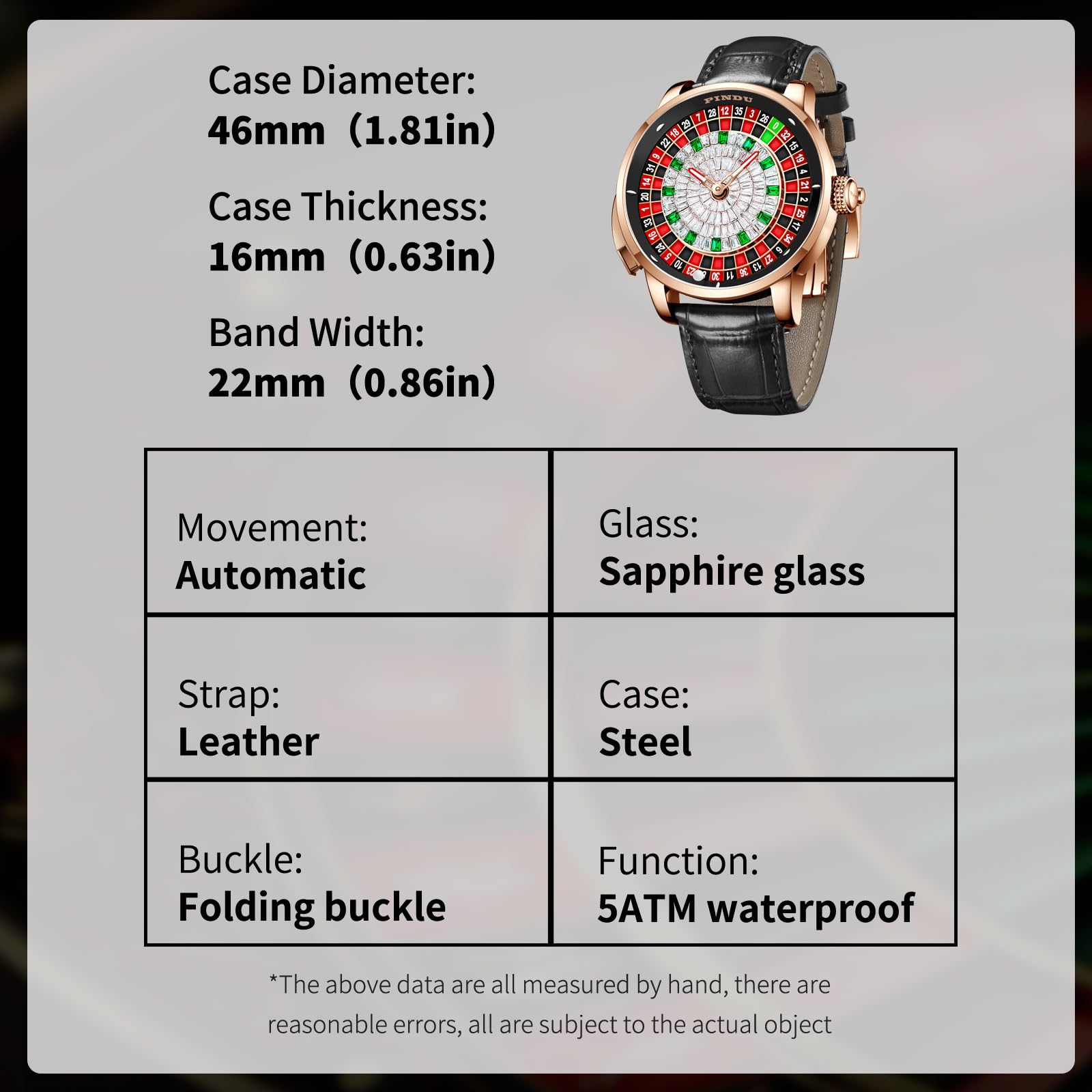 - ⌚【Roulette Watch for Men】Sapphire Glass, Case legth 46mm/1.8in, case thickness: 18mm/0.7in, Case width 22mm/in. Miyota NH35A has an independently modified movement with a solid structure.